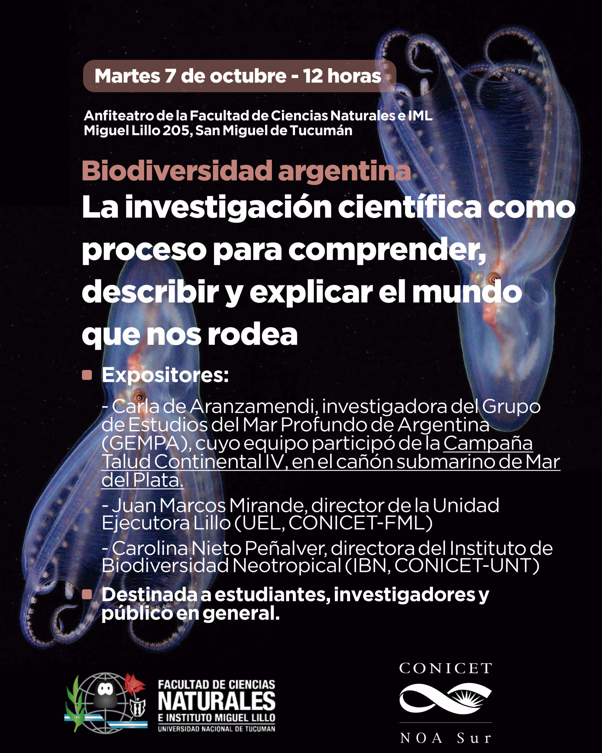 Comentó que aceptó la invitación de visitar Tucumán, no sólo para difundir su labor, sino también para que los tucumanos conozcan los avances en la investigación que lleva adelante en el Cañón Submarino Mar del Plata: “nosotros simplemente queremos seguir haciendo ciencia en argentina, utilizar los subsidios que ya se ganaron con dinero del Banco Interamericano de Desarrollo (BID) y que la ciencia argentina no esté desfinanciada como está”.