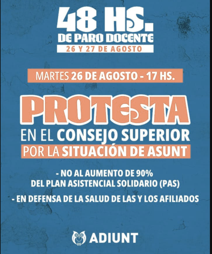 Ese mismo día, a las 17 hs, habrá una protesta en el Consejo Superior por la crítica situación de ASUNT, en rechazo al aumento del 90% del PAS y en defensa de la salud de las y los afiliados.