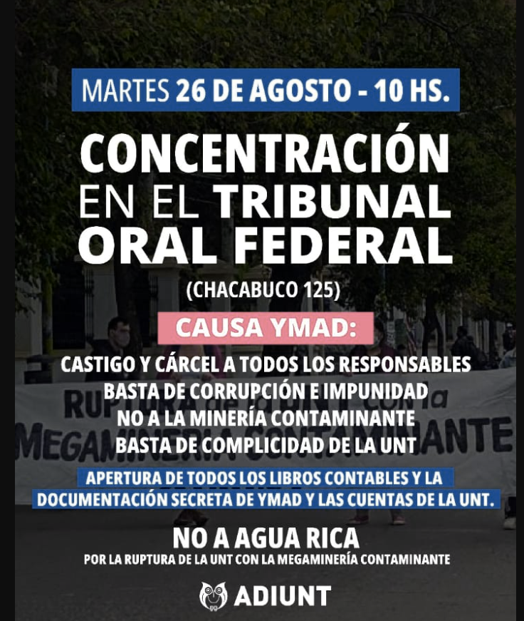 Aquí en la provincia , la ADIUNT convoca a una agenda de actividades para visibilizar los reclamos. Este martes 26 a las 10 hs se realizará una movilización al Tribunal Oral Federal en el marco de la causa YMAD, exigiendo castigo a los responsables, fin de la corrupción y ruptura de la UNT con la megaminería contaminante.