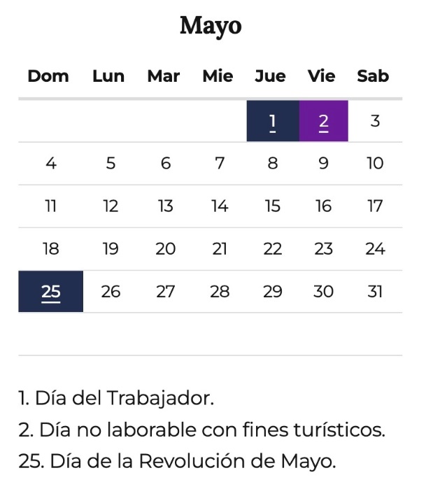 De acuerdo con el calendario oficial de feriados de 2025 aprobado por el Gobierno Nacional, el viernes 2 de mayo es un «Día no laborable con fines turísticos», por ello, no se trata específicamente un feriado obligatorio.