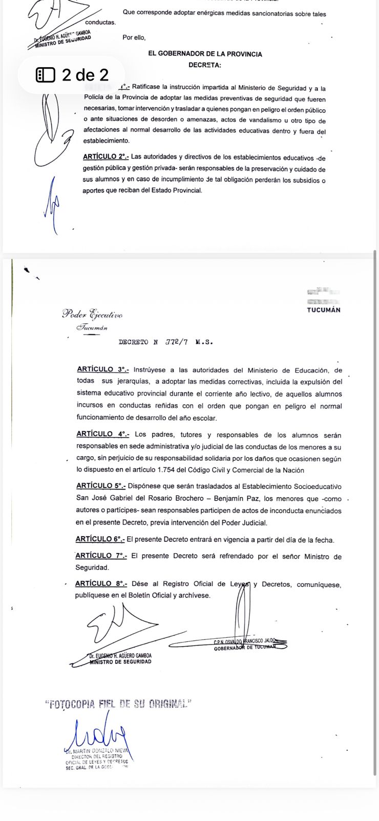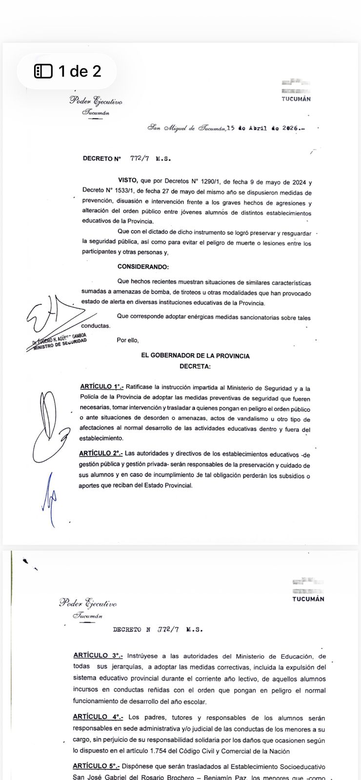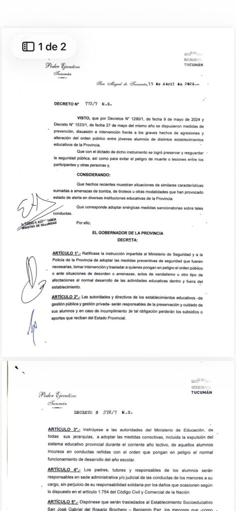 La normativa ratifica las instrucciones impartidas al Ministerio de Seguridad y a la Policía de Tucumán para adoptar todas las medidas necesarias que permitan prevenir hechos de violencia, intervenir ante situaciones de riesgo y garantizar la seguridad dentro y fuera de los establecimientos educativos.