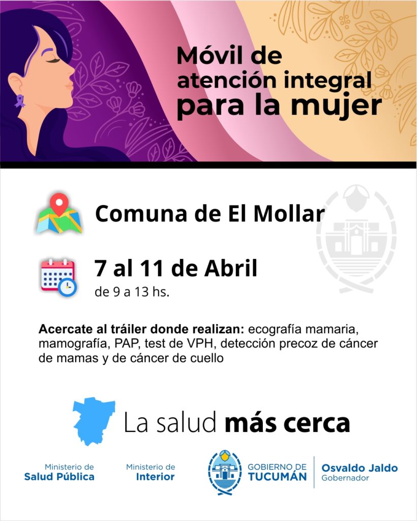 Conocé la oferta prestacional que brindará el móvil desde este 07 al 11 abril en la Comuna del Mollar, de 9 a 13 horas.