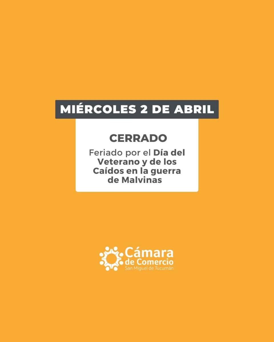 La Cámara de Comercio de San Miguel de Tucumán informa la modalidad de apertura comercial durante el miércoles 2 de Abril, Día del Veterano y de los Caídos en la guerra de Malvinas.