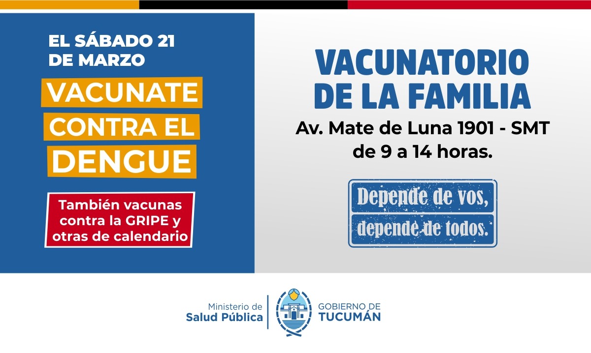 Este sábado 21 de marzo, el Ministerio de Salud Pública de Tucumán, llevará adelante una nueva jornada de vacunación gratuita destinada a prevenir dos enfermedades estacionales: la gripe y el dengue.
