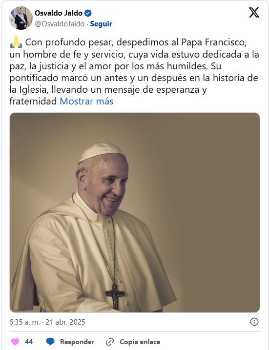 El gobernador, Osvaldo Jaldo, despidió por medio de sus redes sociales al Papa Francisco, tras conocerse la noticia de su fallecimiento en la madrugada de este lunes.
