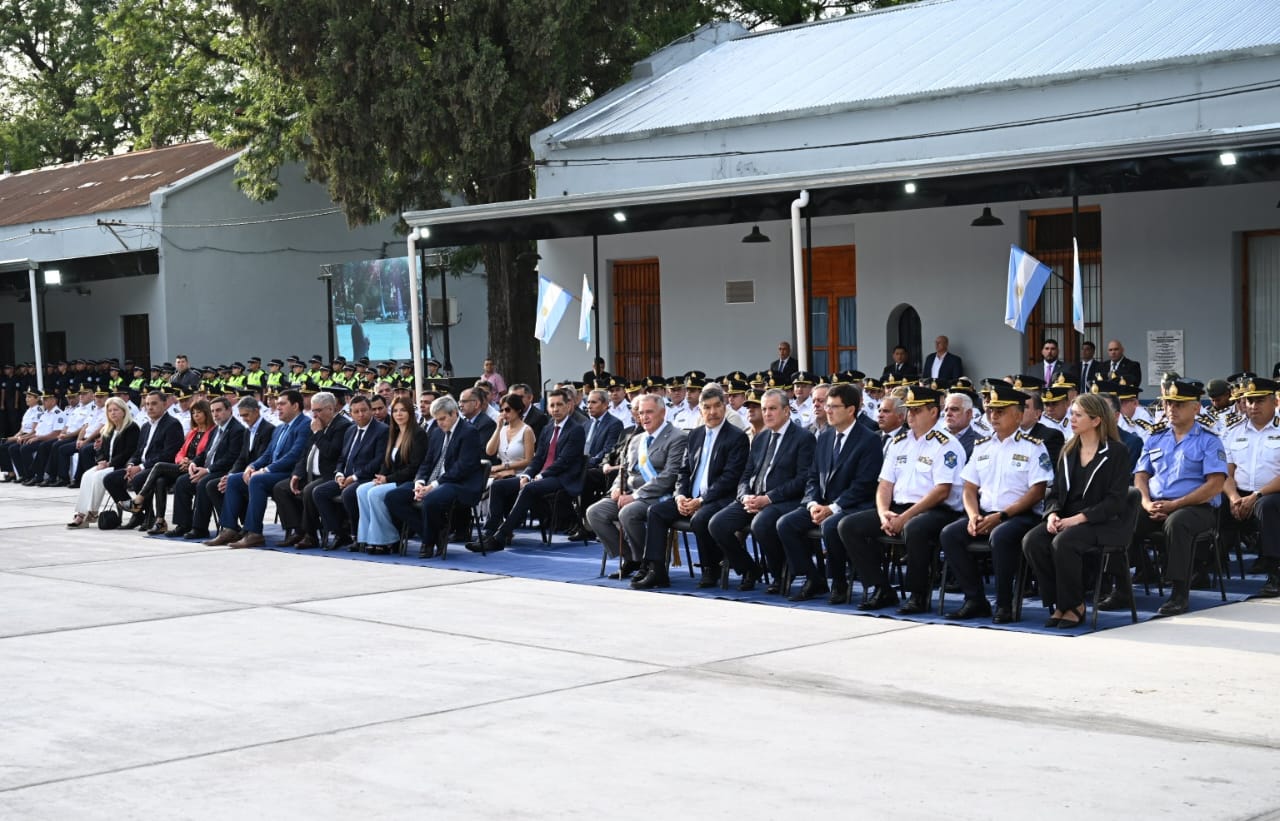 El mandatario mencionó avances en materia de seguridad. Indicó: “esta es la policía que en dos años bajó los homicidios un 50%; esta es la policía que bajó los delitos un 30%; esta es la policía reconocida a nivel nacional por la actual ministra de Seguridad de la Nación, Patricia Bullrich”. Señaló también que la fuerza fue destacada por su aporte a la reducción de índices delictivos a nivel federal.