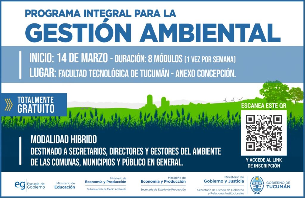 El Gobierno de Tucumán, a través de distintas áreas ministeriales, anunció el lanzamiento del Programa Integral para la Gestión Ambiental, una iniciativa destinada a capacitar a secretarios, directores y gestores del ambiente de comunas, municipios y al público en general. El programa es impulsado por la Escuela de Gobierno, en conjunto con la secretaría de Producción.