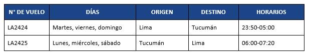 LATAM volará tres veces por semana cubriendo la ruta Tucumán – Lima con aviones A320 con capacidad para 174 pasajeros. Los vuelos se encuentran sujetos a aprobación gubernamental.