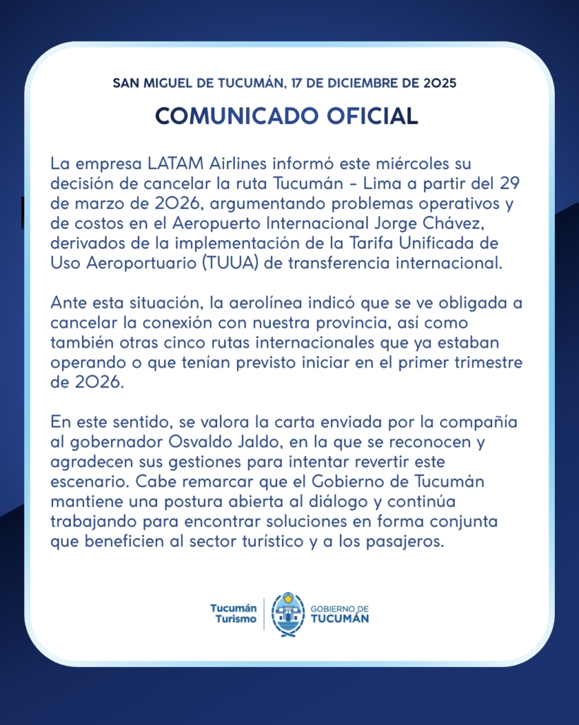 El Gobierno de la Provincia, a través del Ente Tucumán Turismo (ETT), informó que la empresa LATAM Airlines decidió cancelar la ruta Tucumán – Lima a partir del 29 de marzo de 2026. Según comunicó la aerolínea, la medida responde a problemas operativos y al incremento de costos derivados de la implementación de la Tarifa Unificada de Uso Aeroportuario (TUUA) de transferencia internacional en el Aeropuerto Jorge Chávez de la capital peruana.