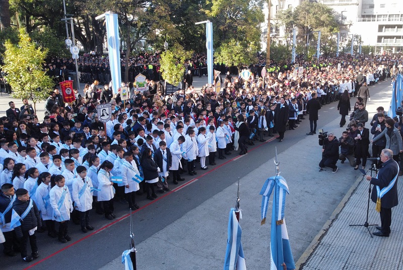 El gobernador, en su discurso, expresó su agradecimiento a las instituciones educativas presentes: “son más de 60 escuelas que se han esforzado para que hoy juntos podamos rendir homenaje a nuestra bandera y a su creador Manuel Belgrano. Muchas gracias a cada uno de los docentes que acompañaron a los niños presentes”.