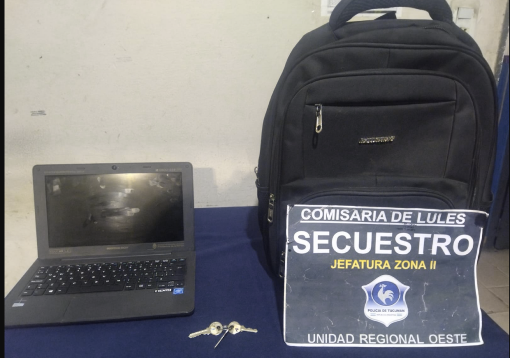 En el interior de la mochila se encontraron una notebook negra marca Positivo BGH (Conectar Igualdad) y un juego de llaves, elementos que fueron reconocidos como los sustraídos. El joven fue trasladado a la dependencia policial en calidad de aprehendido junto a los bienes recuperados.